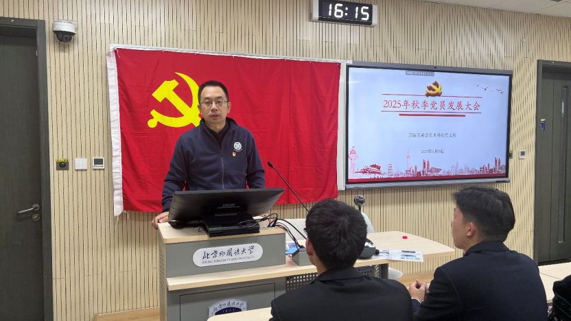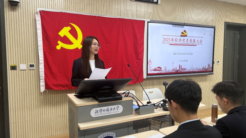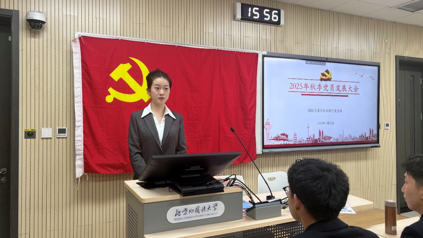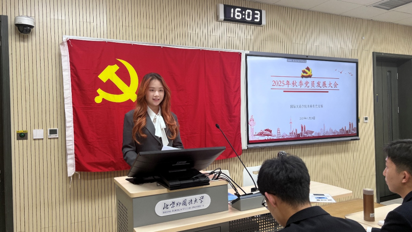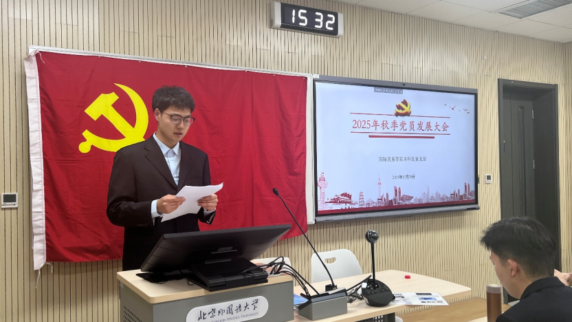 2025年11月28日下午,国际关系学院本科生党支部在国际大厦431教室召开2025年秋季党员发展大会。会议由本科生党支部书记张顾子煊主持,国际关系学院党总支副书记彭澍出席并讲话,支部全体党员、发展对象和部分积极分子参加大会。