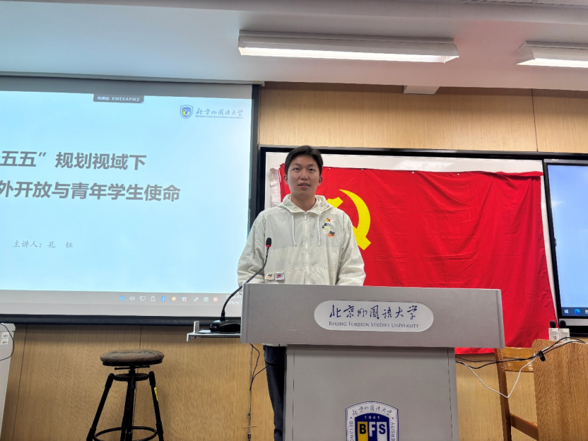 活动伊始,孔钰同志围绕两会总体精神与“十五五”规划的核心内容进行系统梳理。从我国当前发展阶段出发,分领域梳理了“十五五”时期的总体部署,指出“十五五”规划是在复杂国际环境与新发展要求背景下,对未来发展路径作出的系统性安排。随后他结合中欧班列、云南瑞丽产业协作园、海南自由贸易港等实例对“扩大高水平对外开放”这一重点领域展开深入分析和阐释。通过对“十五五”整体规划结构与重点领域的解读,他帮助同学们从整体上把握国家发展的方向与重点,进一步深化了对两会精神的理解,同时也引导同学们思考青年在国家发展中的角色与责任,鼓励同学们将个人发展融入国家对外开放进程,在更广阔的视野中规划成长路径。